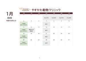 休診:水曜日(5日、12日、19日、26日) 午後休診:日曜(2日、9日※受付は11時まで) 祝日:文化の日(3日)、勤労感謝の日(23日、24日※振替休日) 変則診察:11月1日(土)院長が亀岡わんわんフェススタ2025に参加するため、午前中はフード、薬(事前処方)、トリミングのみとさせて頂きます(午後は16時から通常診察) 変則診察:11月9日(日)院長がセミナーに参加するため受付を11時までとさせて頂きます。 臨時休診:11月11日(火)社員研修のため臨時休診とさせて頂きます。 臨時休診:11月15日(土)所用により臨時休診とさせて頂きます。 臨時休診:11月16日(日)院長がセミナーに参加するため臨時休診とさせて頂きます。