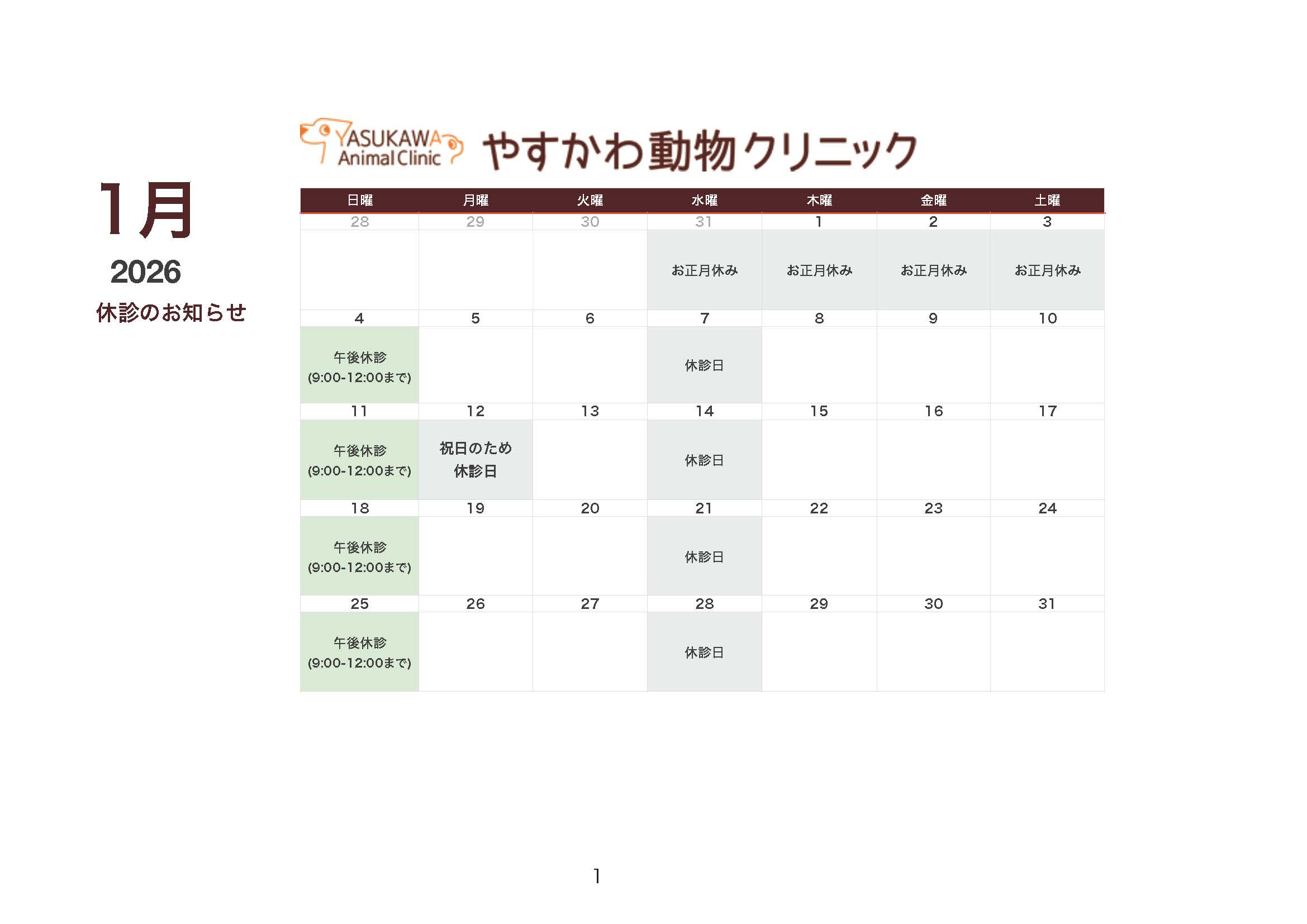 休診:水曜日(7日、14日、21日、28日) 午後休診:日曜(4日、11日、18日、25日 ※受付は11時まで) 祝日:成人の日(12日) お正月休み:12月30日(火)から2026年1月3日(土)までお正月休みとさせて頂きます。