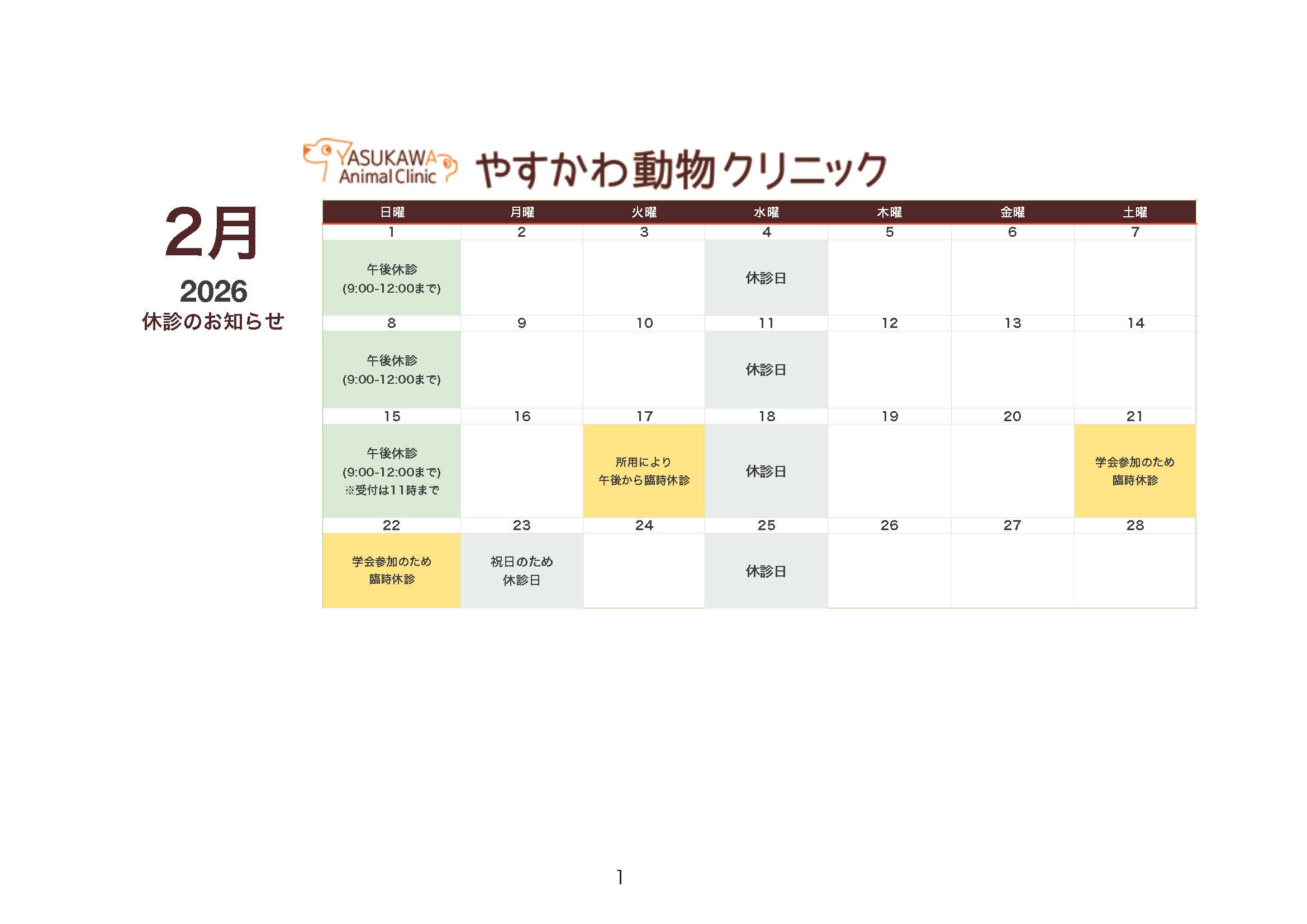 2026年1月の休診・臨時休診について